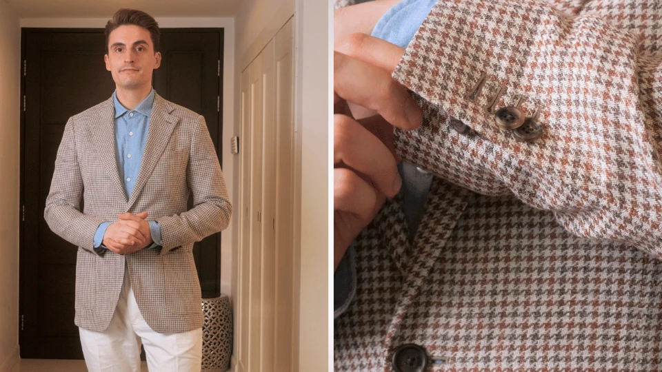 - Description: A light summer jacket made from a linen-silk-cotton blend featuring a Gun Check pattern with a 4-inch notch lapel.