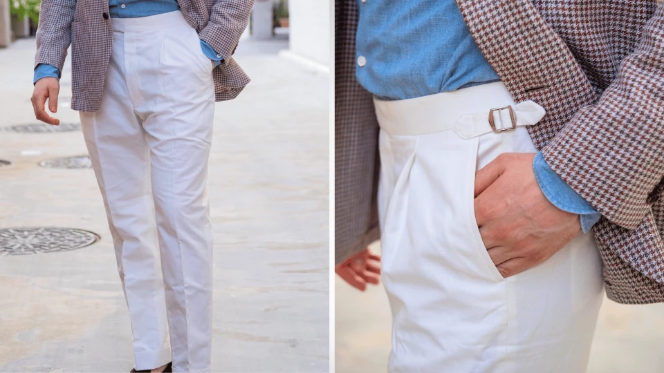 - Description: White cotton and linen dress pants featuring side adjusters and brown horn buttons with single pleats and a 2-inch cuff.